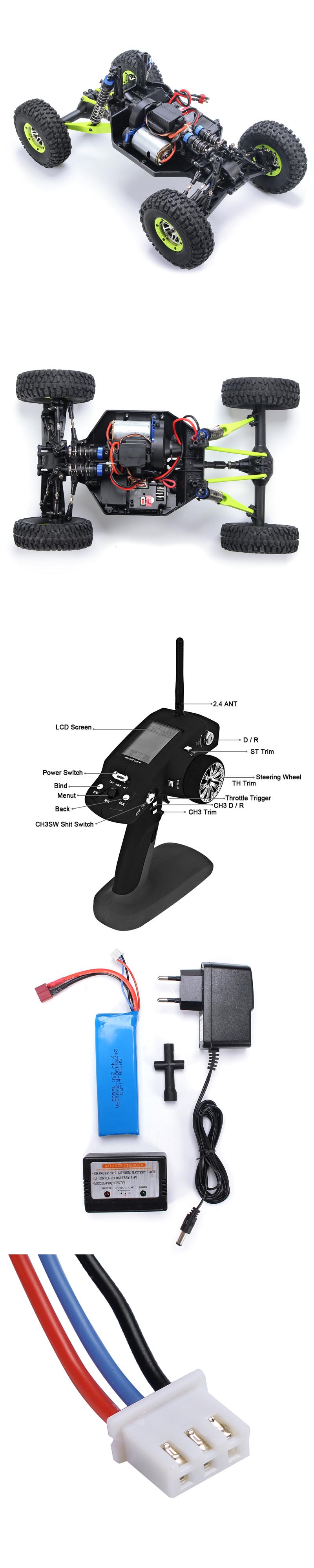 Каналы управления: 4 канала Режим контроллера: Режим 2 Направление движения: Вперед, назад, влево, вправо Функция: 2,4 ГГц полномасштабная рулевая машина с 4WD системой, все металлические шестерни и инженерные нейлоновые, достигающие целей о избегании столкновений, поглощении ударов и предотвращении падений Система независимой подвески на четырех колесах, подходящая для различных автогонок, технология 2.4 ГГц, поддерживающая высокую скоростные гонки машин одновременно с дальностью радиоуправления более 100 метров Частота передатчика: 2.4G Уровень передач: 1:18.7 / 1:33 (Двойная скорость) Расстояние контроля: около 100м Пропорциональное дистанционное управление или нет: Да | Аккумулятор для автомобиля: 7,4 В 2200 мАч аккумуляторная батарея (включена) Батарея для передатчика: 4 x AA батарейки (не включены) Время выполнения: около 20 минут Время зарядки: 4 часа | ||